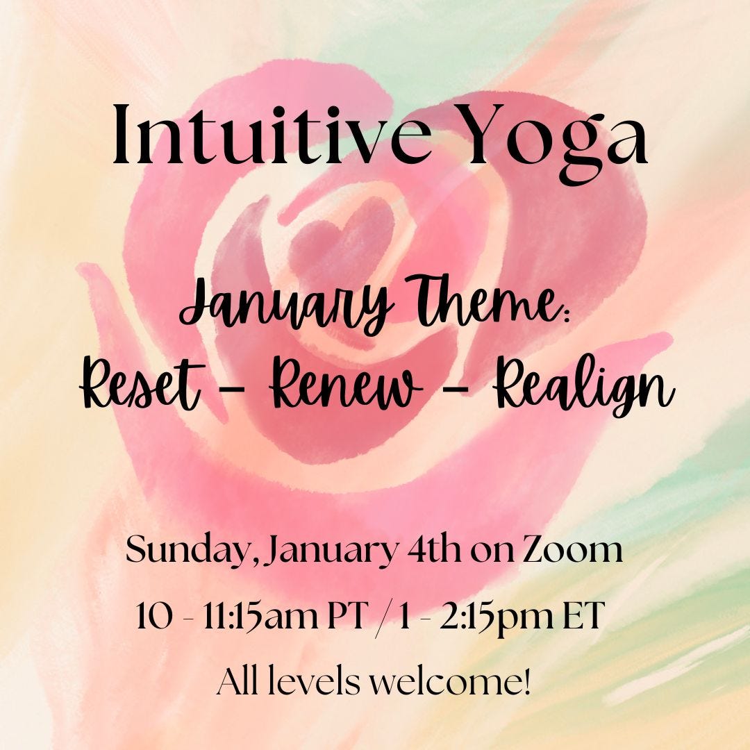 I invite you to join my upcoming Intuitive Yoga class on Sunday, January 4th at 10am Pacific/1pm Eastern on Zoom. The focus for January’s Intuitive Yoga practice is to reset the body, renew our energy, and realign with our natural rhythm as we step into the new year.